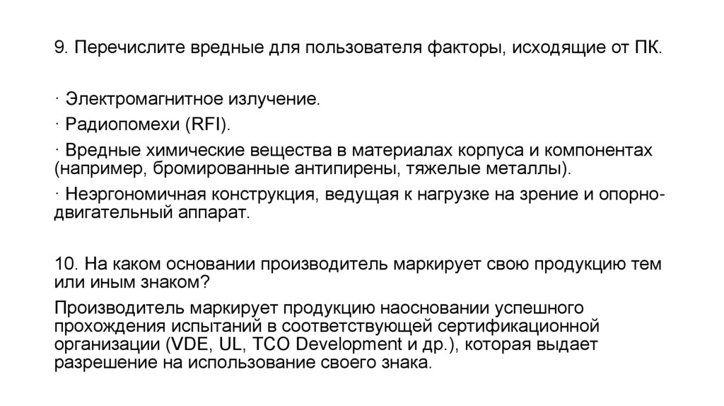 9. Перечислите вредные для пользователя факторы, исходящие от ПК.· Электромагнитное излучение.