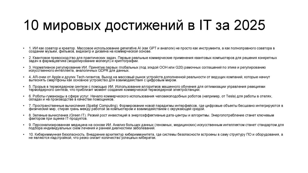 10 мировых достижений в IT за 20251. ИИ как соавтор и креатор. Массовое использование generative AI (как GPT и аналоги) не просто как инструмента, а как полноправного соавтора в