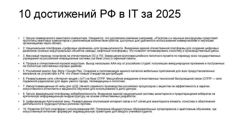 10 достижений РФ в IT за 20251. Запуск коммерческого квантового компьютера. Ожидается, что российские компании (например, «Росатом») и научные консорциумы представят