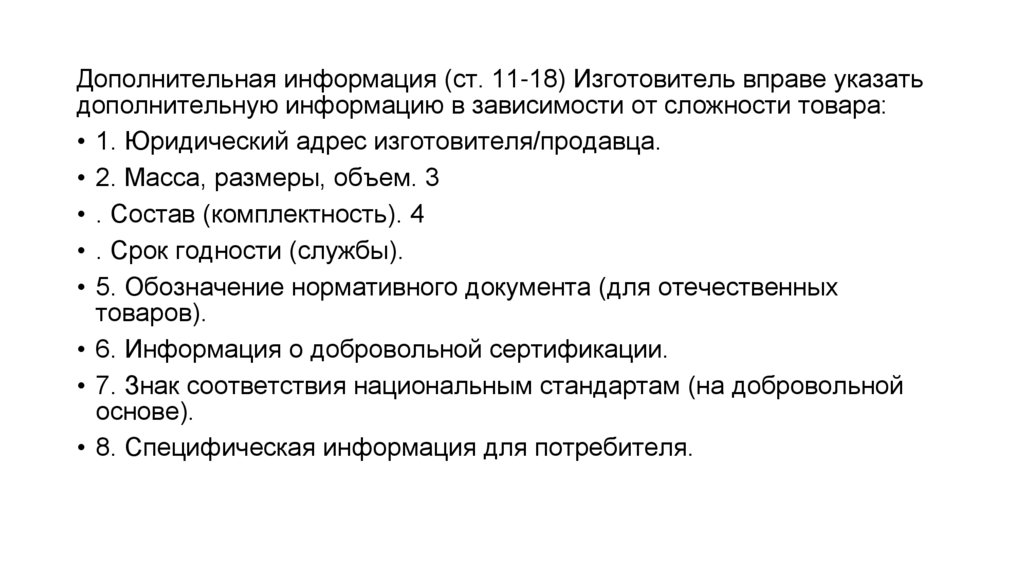 Дополнительная информация (ст. 11-18) Изготовитель вправе указатьдополнительную информацию в зависимости от сложности товара: