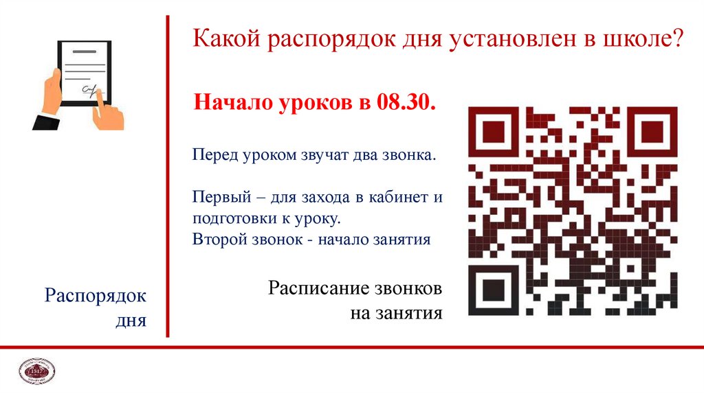 Какой распорядок дня установлен в школе?Начало уроков в 08.30.