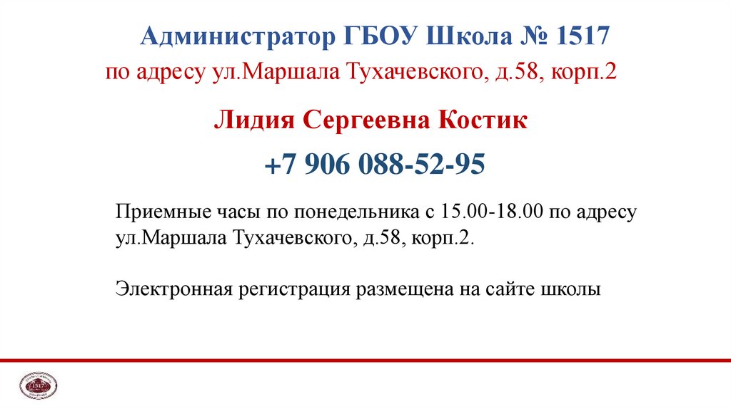 Администратор ГБОУ Школа № 1517по адресу ул.Маршала Тухачевского, д.58, корп.2