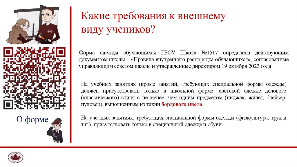 Форма одежды обучающихся ГБОУ Школа №1517 определена действующим