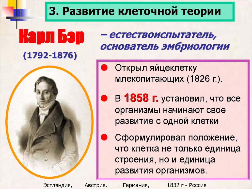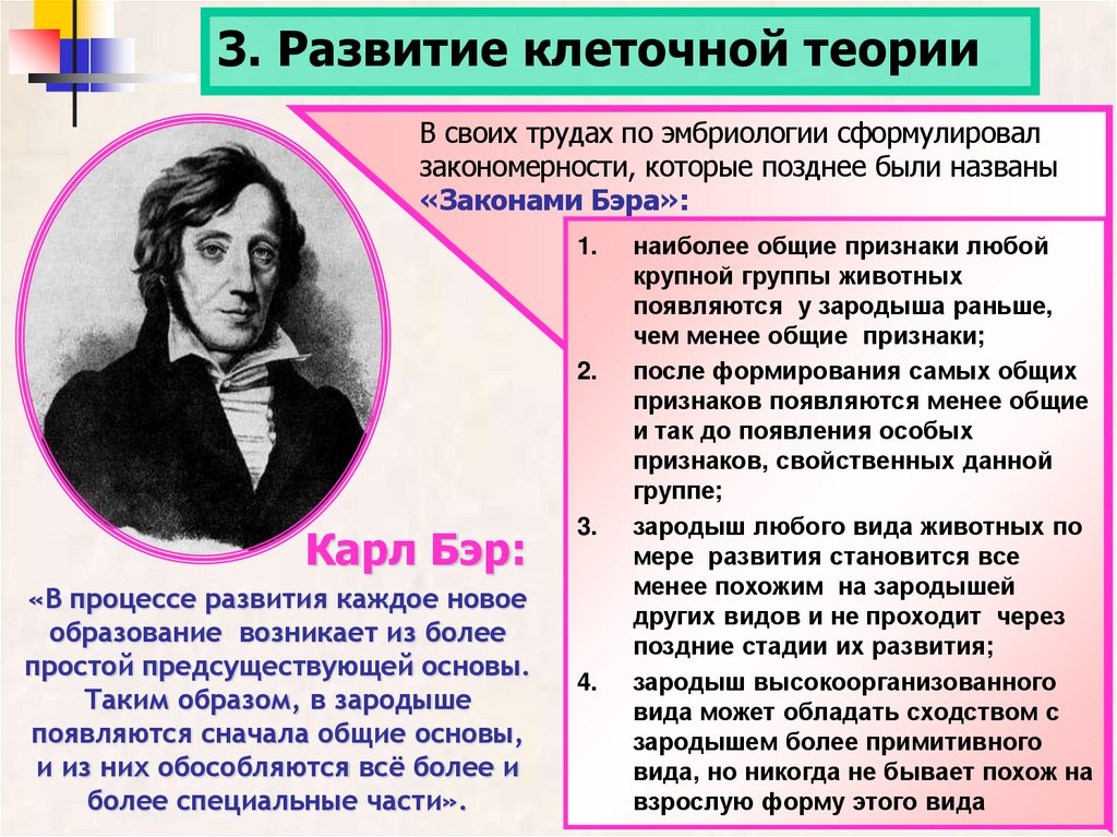 3. Развитие клеточной теорииВ своих трудах по эмбриологии сформулировал