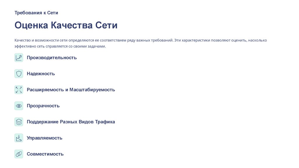 Качество и возможности сети определяются ее соответствием ряду важных требований. Эти характеристики позволяют оценить, насколько