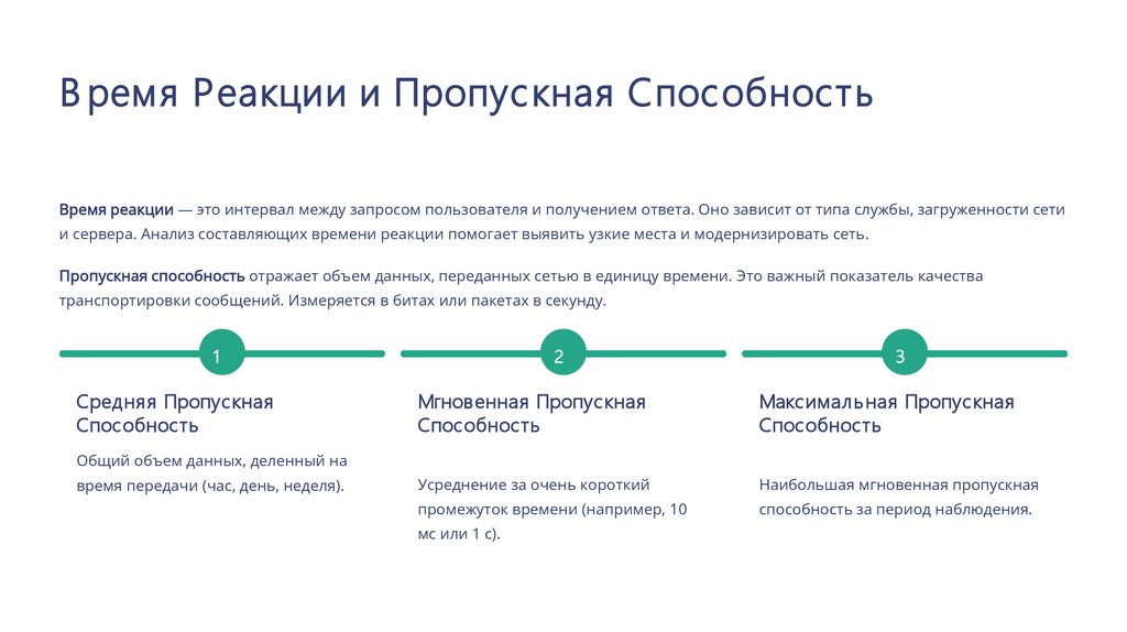В ремя Реакции и Пропускная СпособностьВремя реакции — это интервал между запросом пользователя и получением ответа. Оно зависит от типа службы, загруженности сети