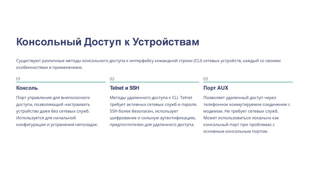 Консольный Доступ к УстройствамСуществуют различные методы консольного доступа к интерфейсу командной строки (CLI) сетевых устройств, каждый со своими
