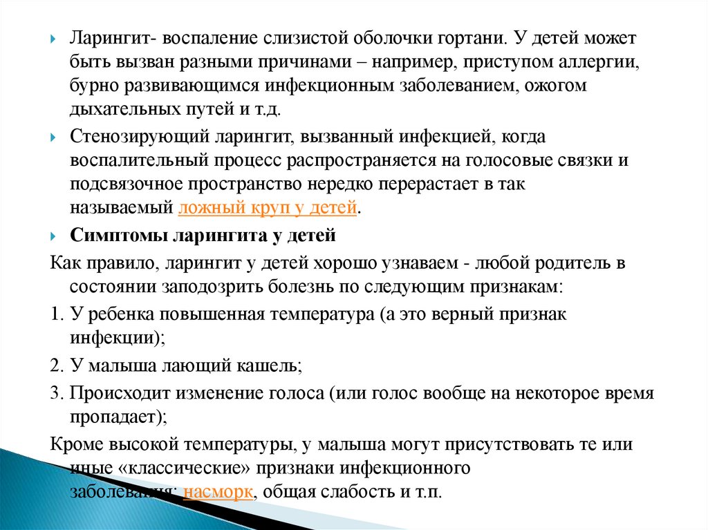 Ларингит- воспаление слизистой оболочки гортани. У детей можетбыть вызван разными причинами – например, приступом аллергии,