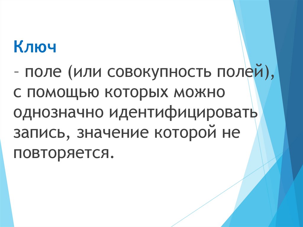 Каждая запись в таблице должна иметь такназываемый первичный ключ, т.е поле,