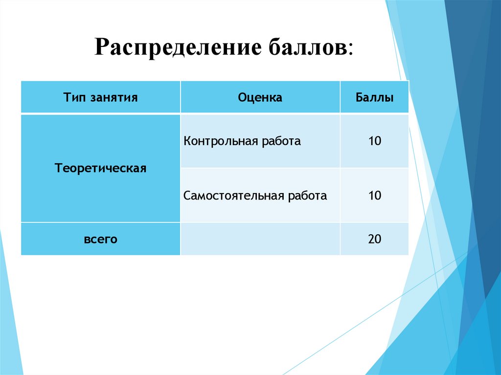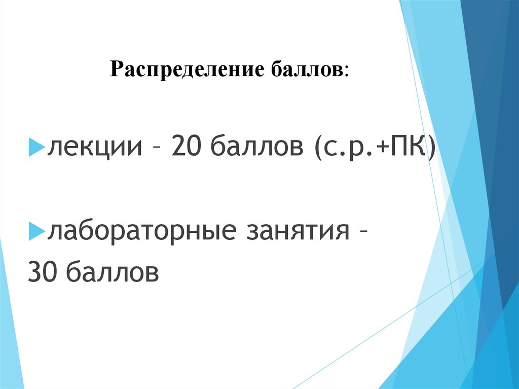 Распределение баллов:лекции – 20 баллов (с.р.+ПК)