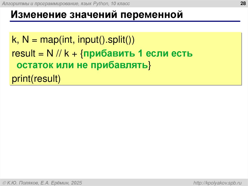 result = N // k + {прибавить 1 если есть