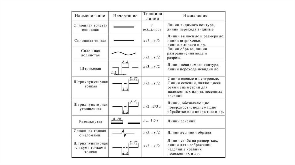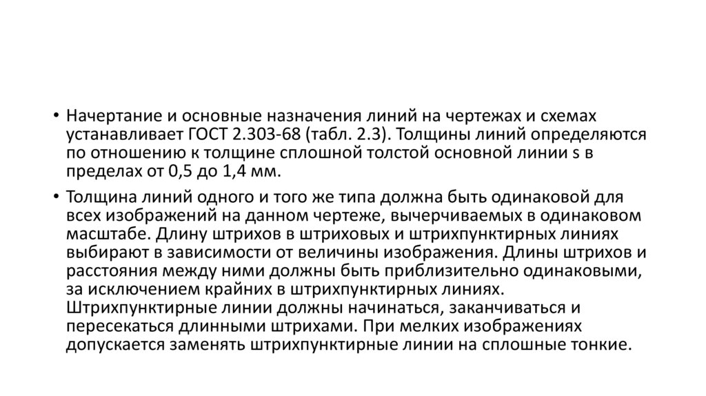 • Начертание и основные назначения линий на чертежах и схемахустанавливает ГОСТ 2.303-68 (табл. 2.3). Толщины линий определяются