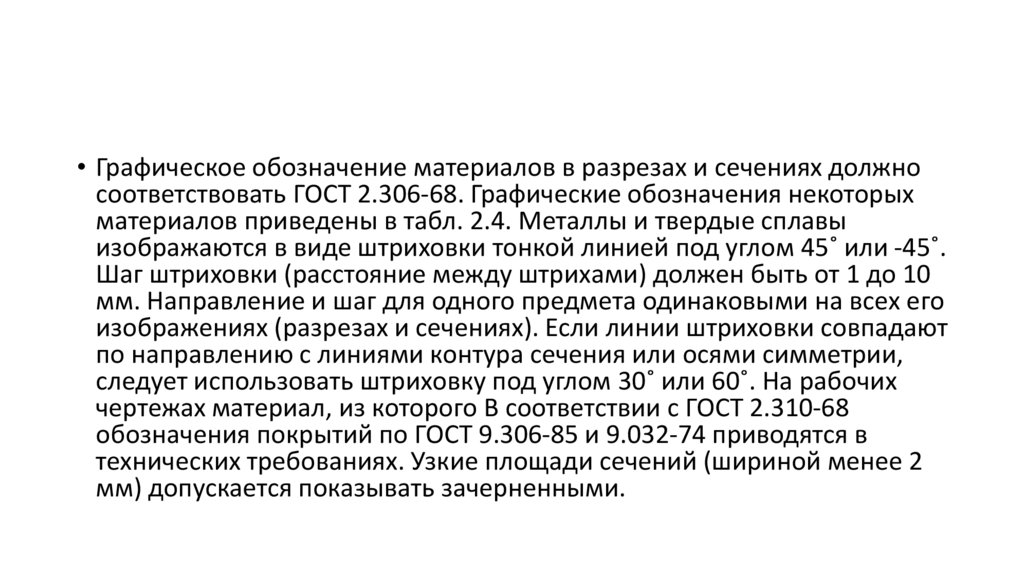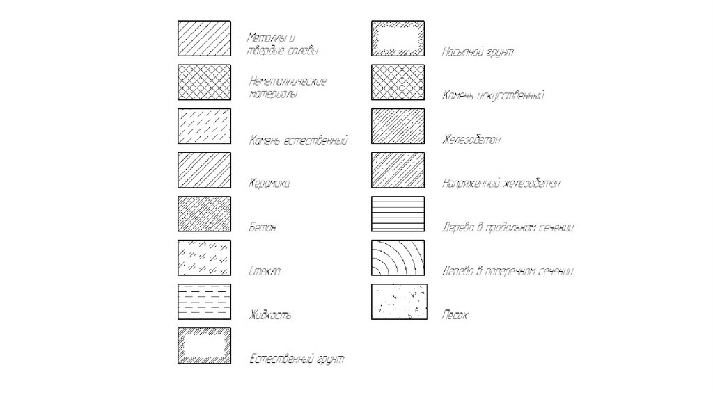 • Графическое обозначение материалов в разрезах и сечениях должносоответствовать ГОСТ 2.306-68. Графические обозначения некоторых