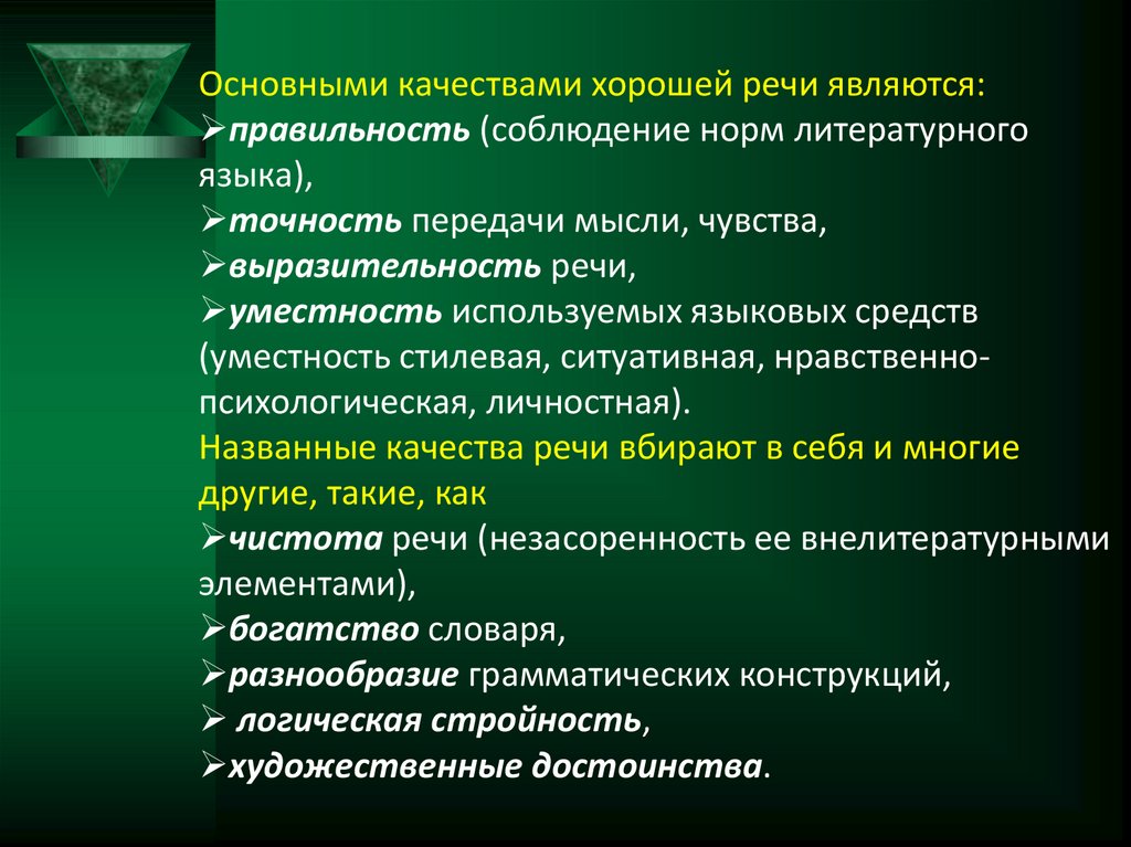 Основными качествами хорошей речи являются:правильность (соблюдение норм литературного
