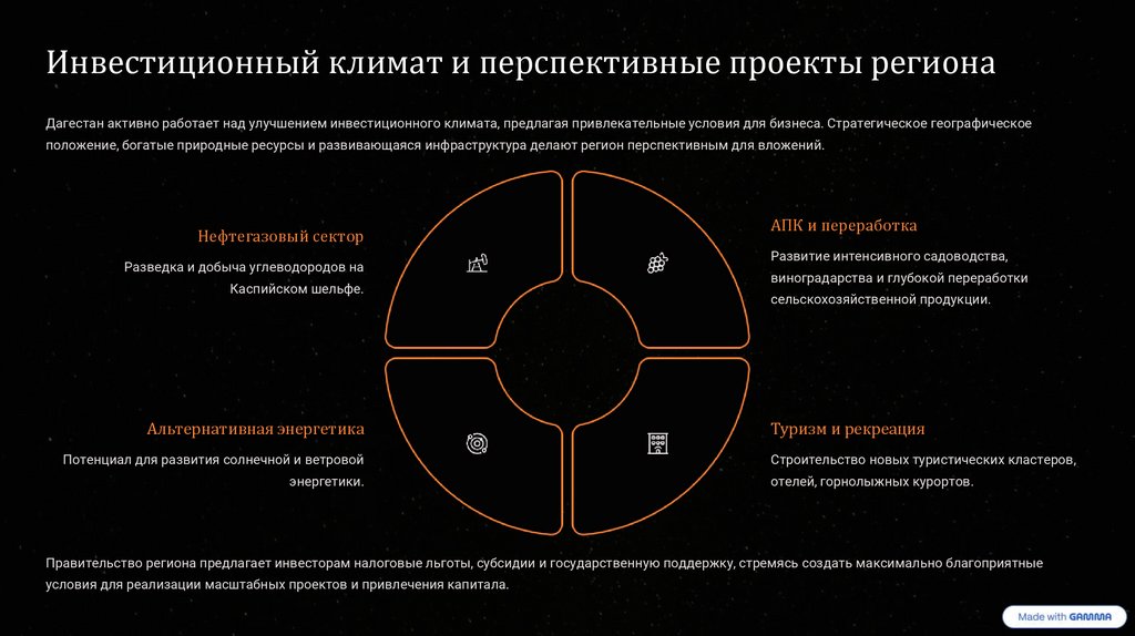 Инвестиционный климат и перспективные проекты регионаДагестан активно работает над улучшением инвестиционного климата, предлагая привлекательные условия для бизнеса. Стратегическое географическое