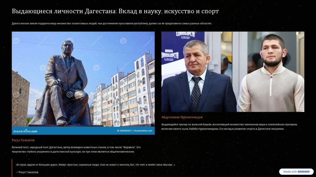 Выдающиеся личности Дагестана: Вклад в науку, искусство и спортДагестанская земля подарила миру множество талантливых людей, чьи достижения прославили республику далеко за её пределами в самых разных областях.