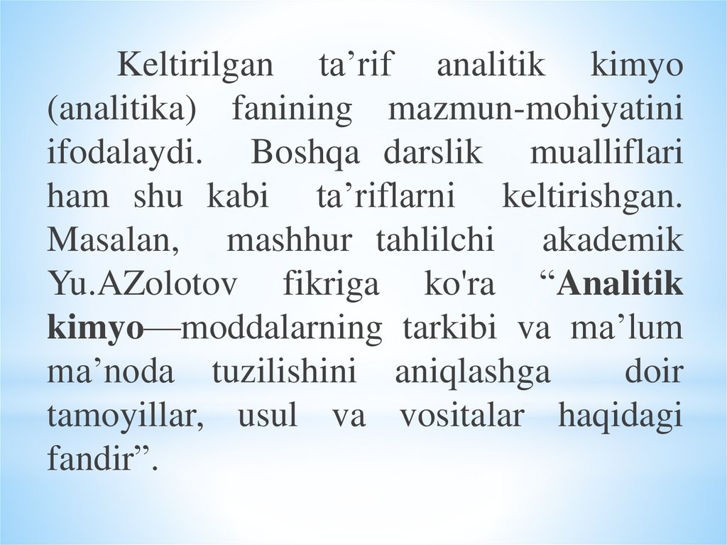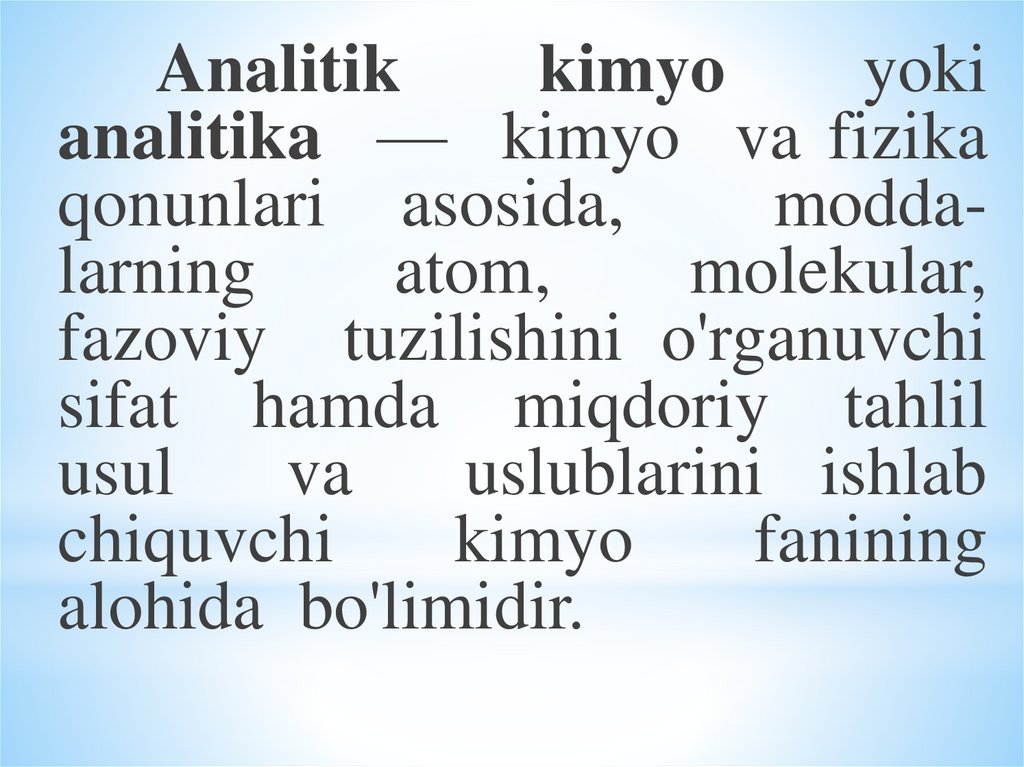 Keltirilgan ta’rif analitik kimyo(analitika) fanining mazmun-mohiyatini