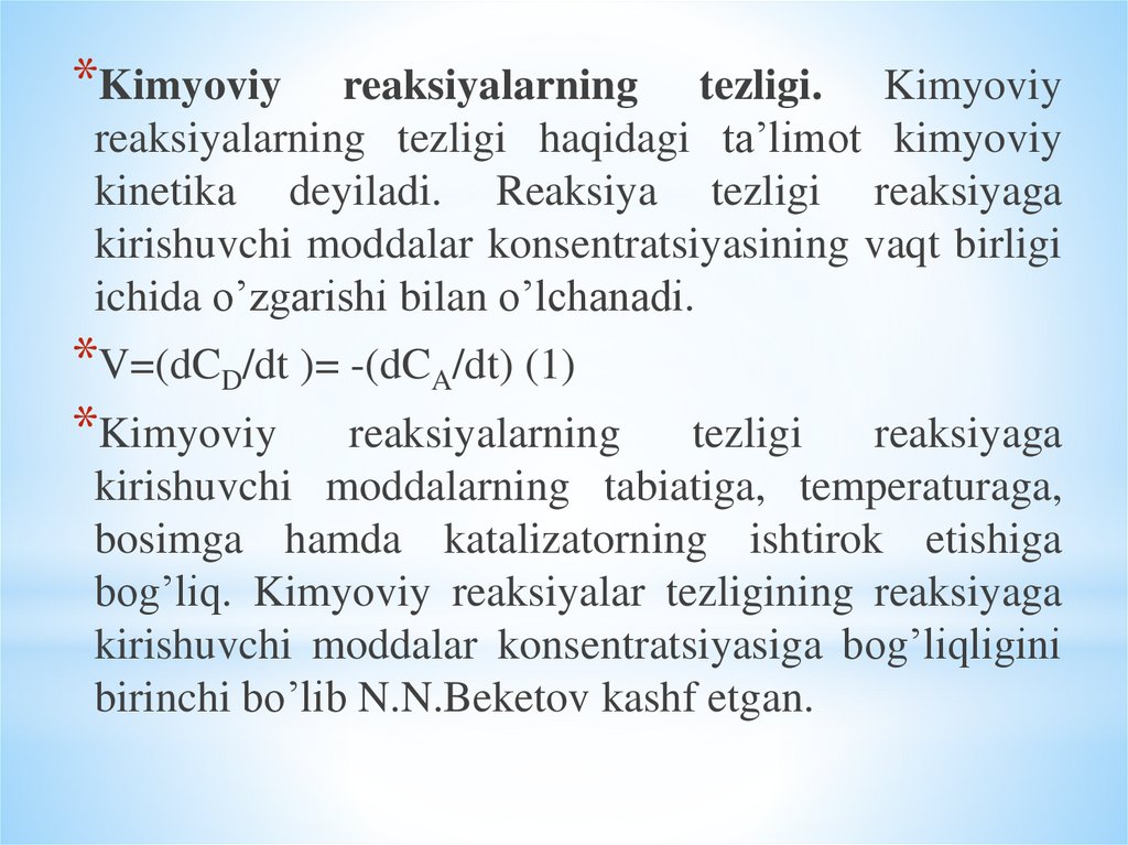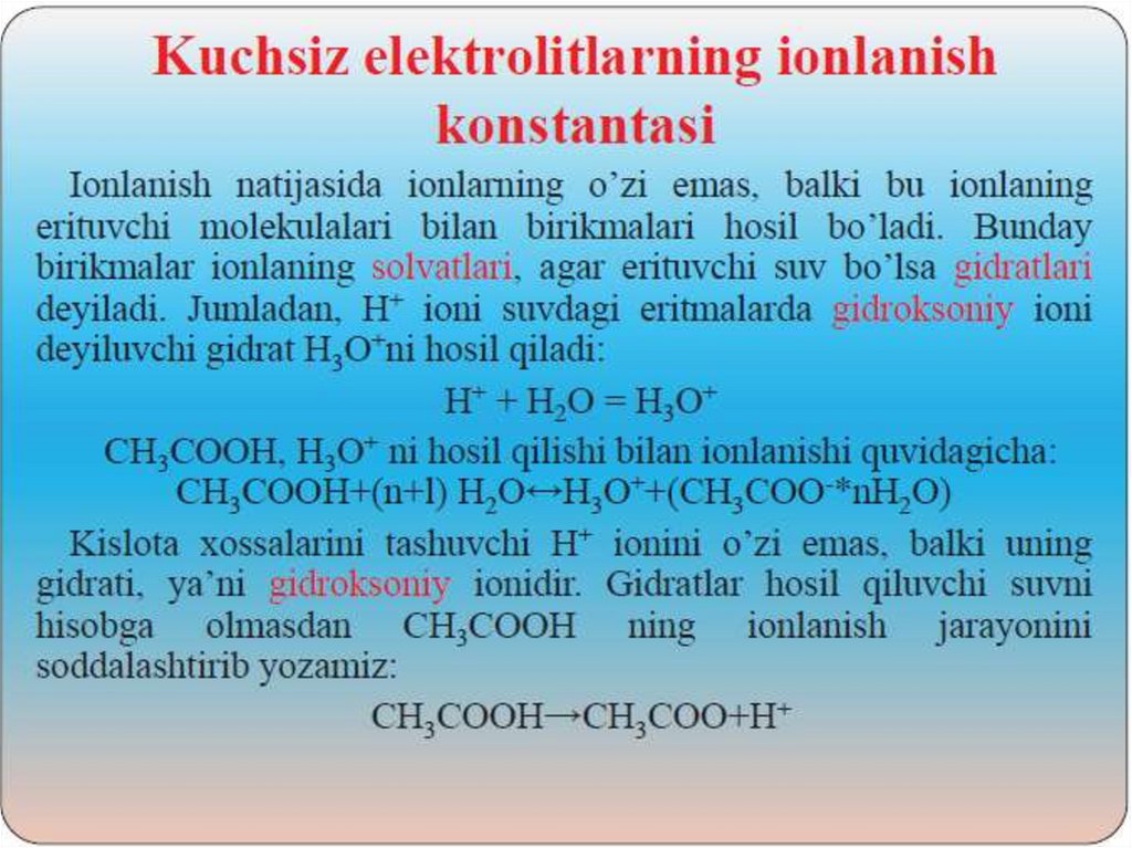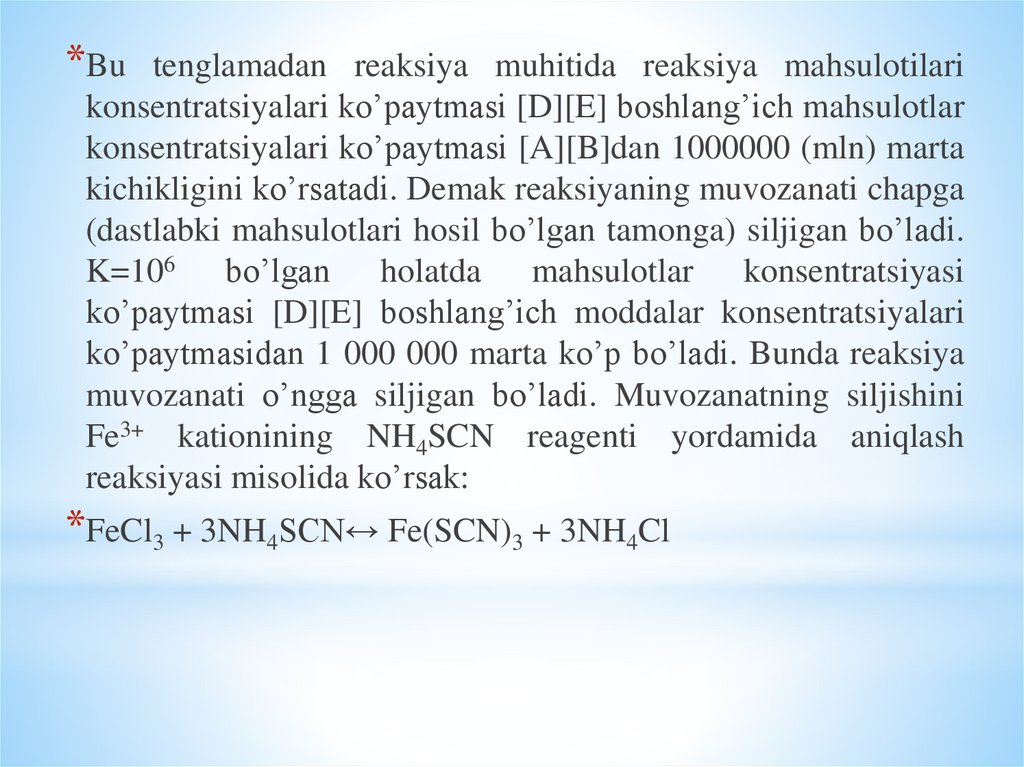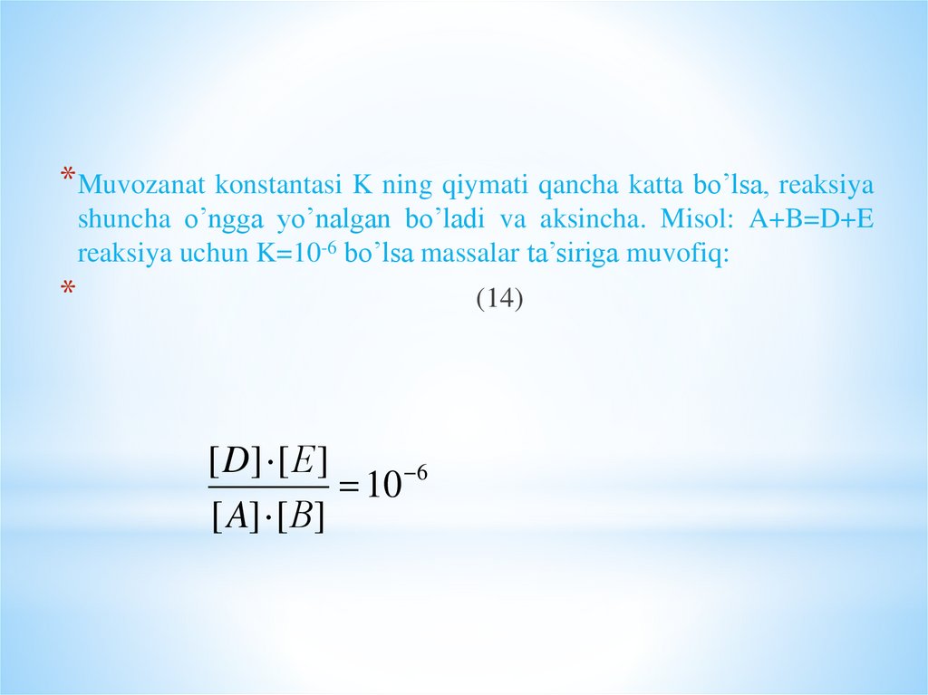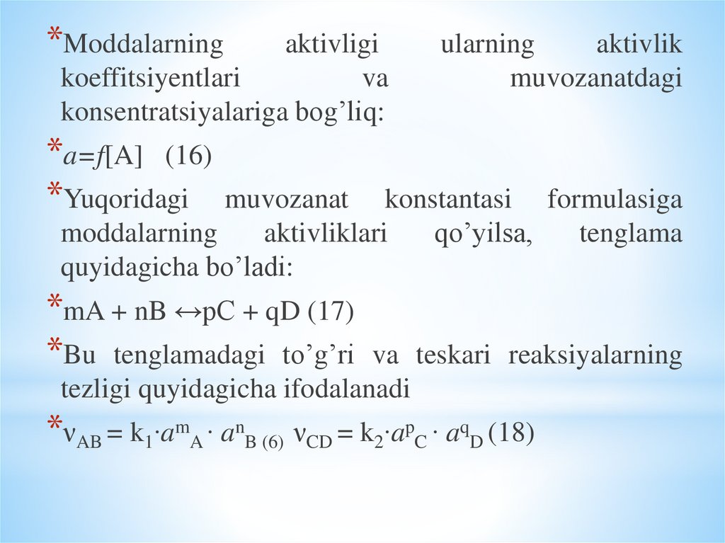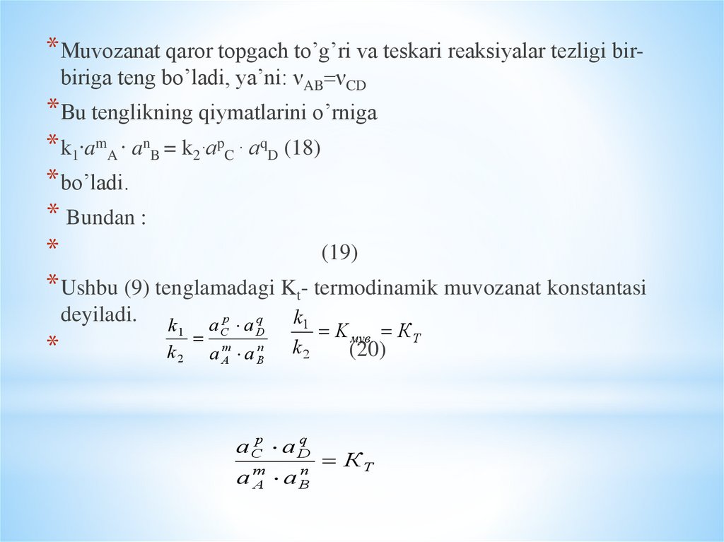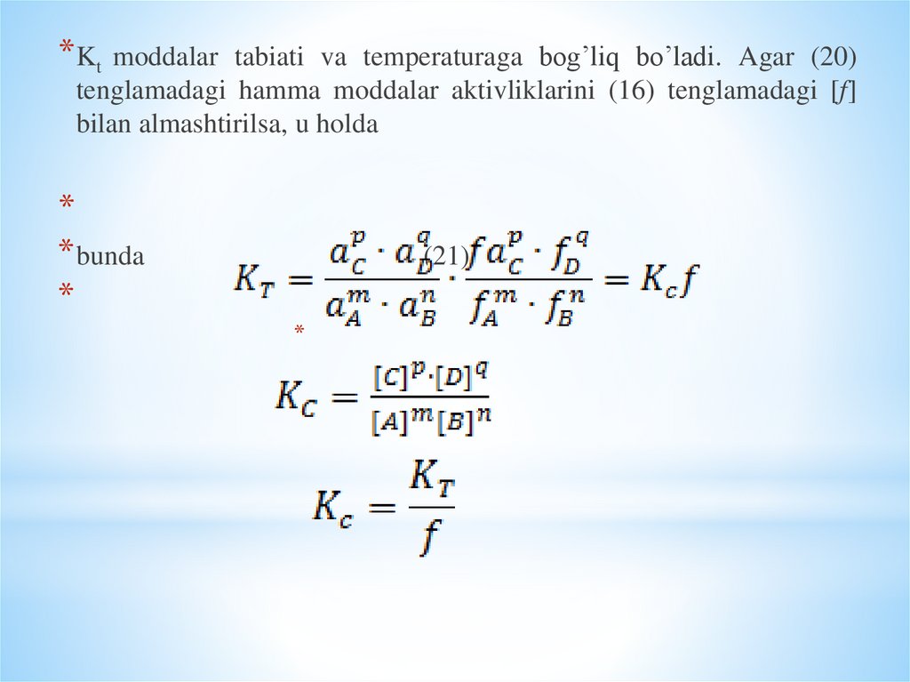 * Ushbu (9) tenglamadagi Kt- termodinamik muvozanat konstantasi