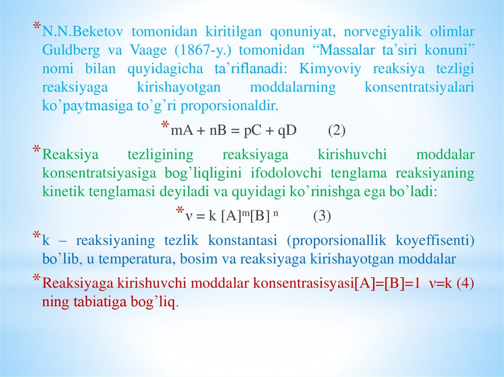 Aktivlik haqidagi ta’limotga asosan, massalar ta’siri qonuni