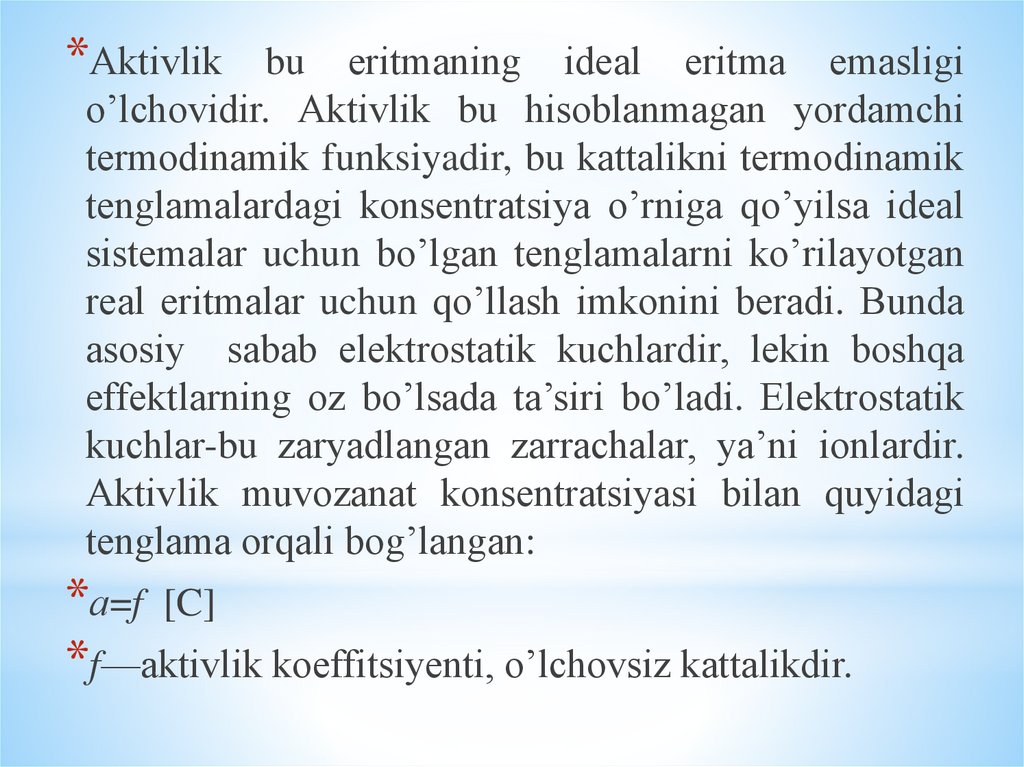 mumkin. O’rtacha aktivlik koeffitsiyenti eritmaning ion