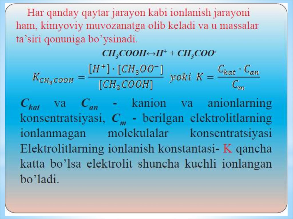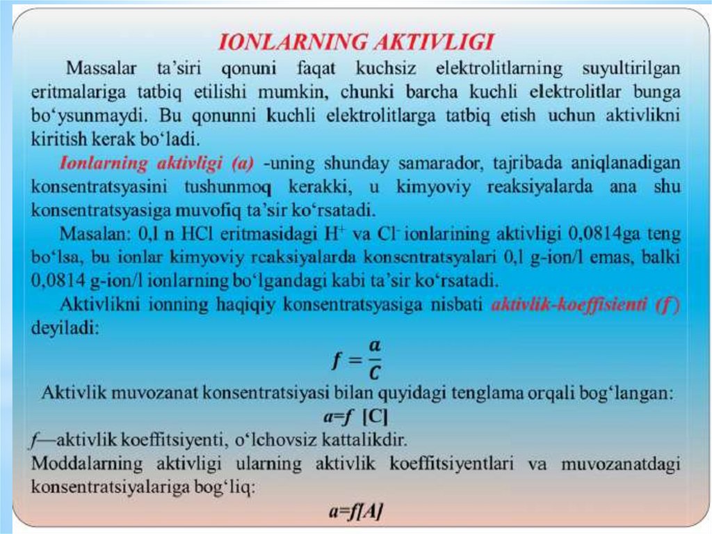 tenglamasiga ionlarning konsentratsiyasi emas, balki ularning