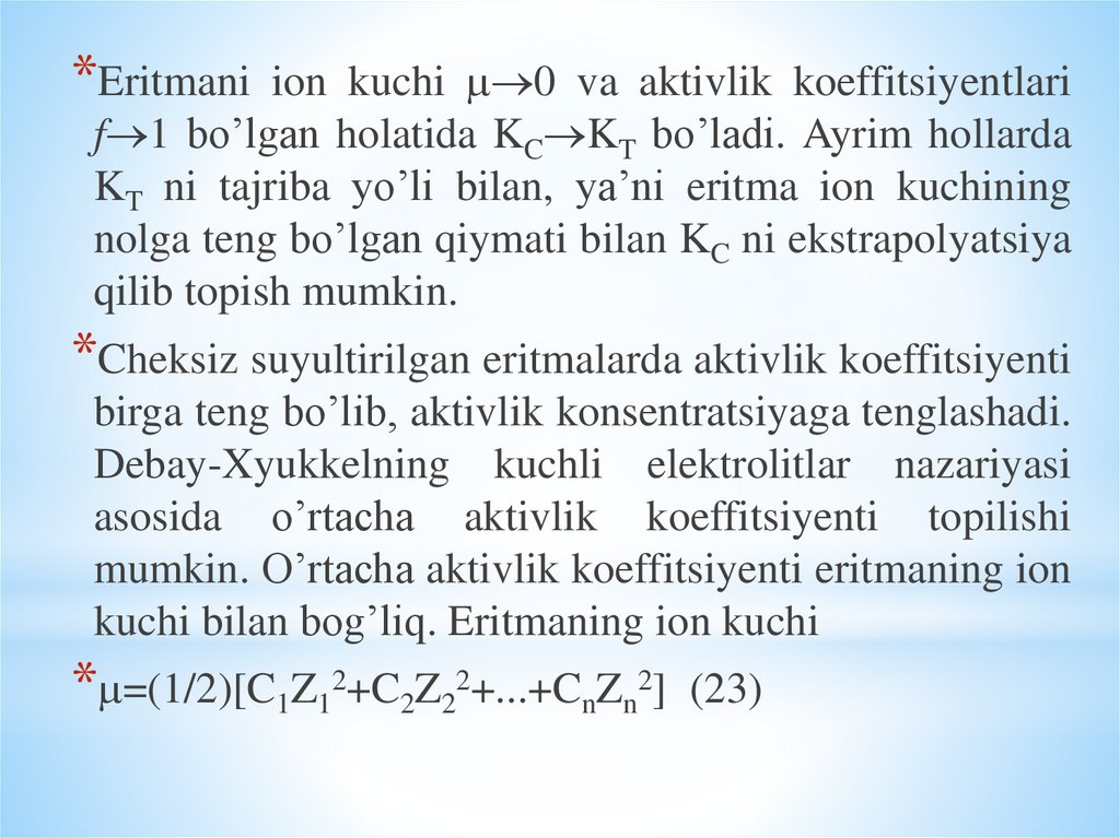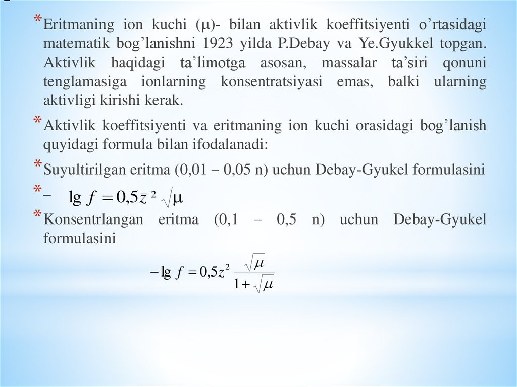 * Konsentrlangan eritma (0,1 – 0,5 n) uchun Debay-Gyukel