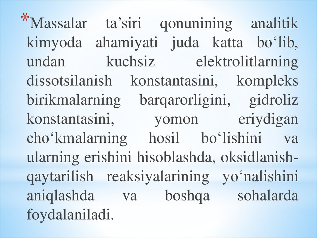 ** Massalar ta’siri qonuni analitik kimyoda turli analitik reaksiyalarda