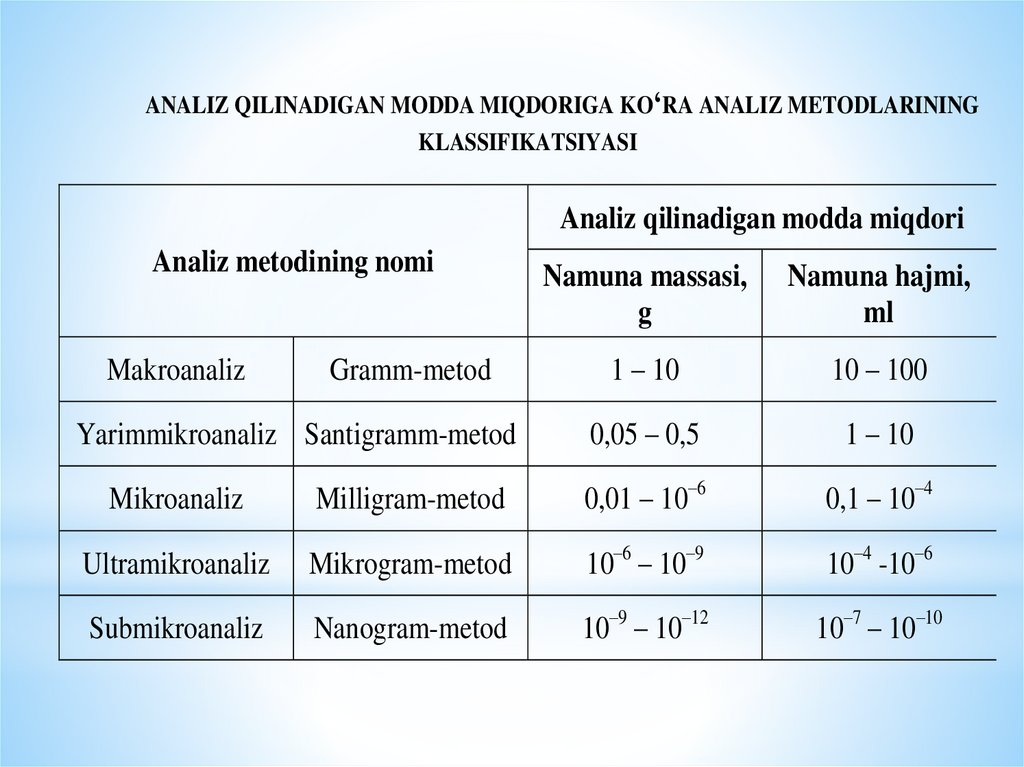 ANALIZ QILINADIGAN MODDA MIQDORIGA KO‘RA ANALIZ METODLARININGKLASSIFIKATSIYASI