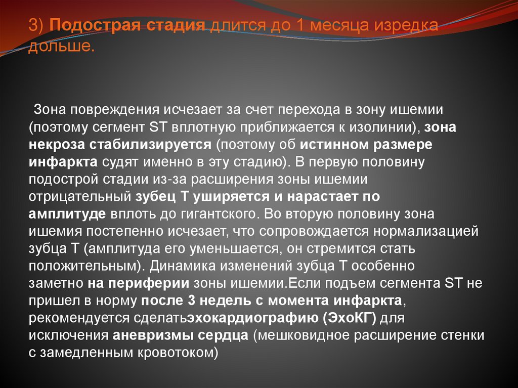 (начиная с субэндокардиальных отделов), дисфункция пораженного желудочка (в