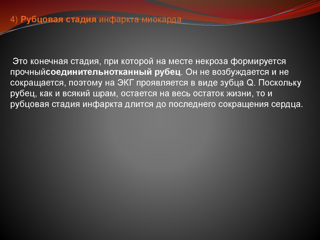 месяца и позже. При мелкоочаговом инфаркте миокарда рубец может образовываться в более ранние