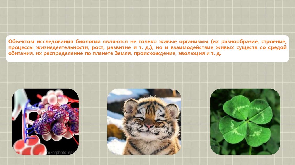 Объектом исследования биологии являются не только живые организмы (их разнообразие, строение,процессы жизнедеятельности, рост, развитие и т. д.), но и взаимодействие живых существ со средой