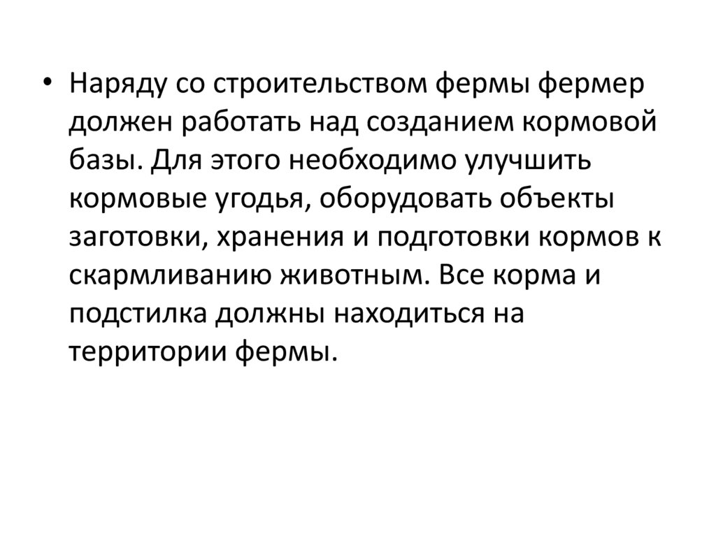 • Наряду со строительством фермы фермердолжен работать над созданием кормовой