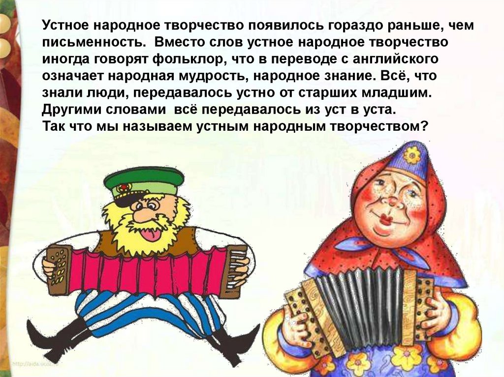 Устное народное творчество появилось гораздо раньше, чемписьменность. Вместо слов устное народное творчество
