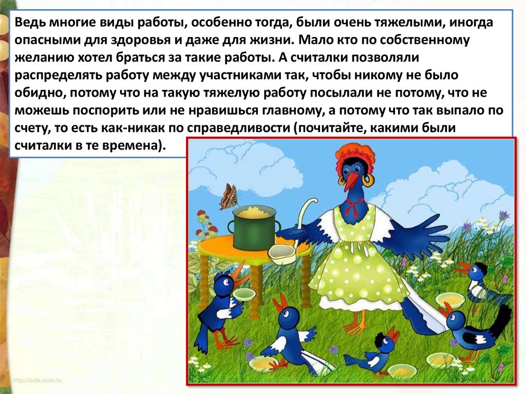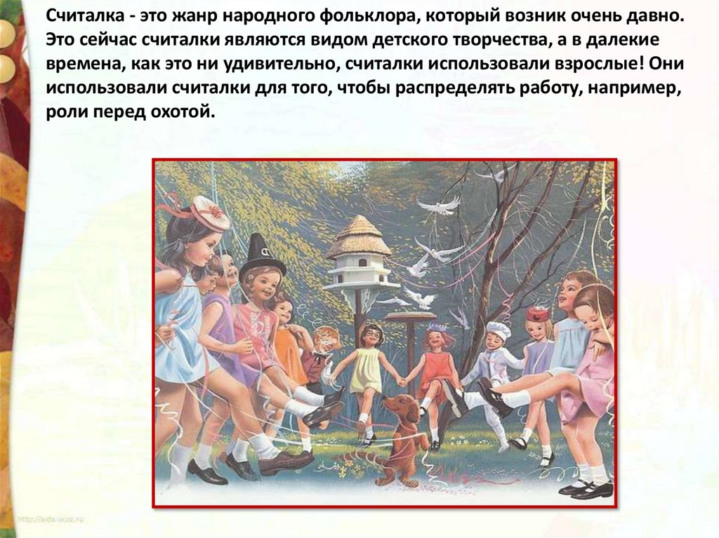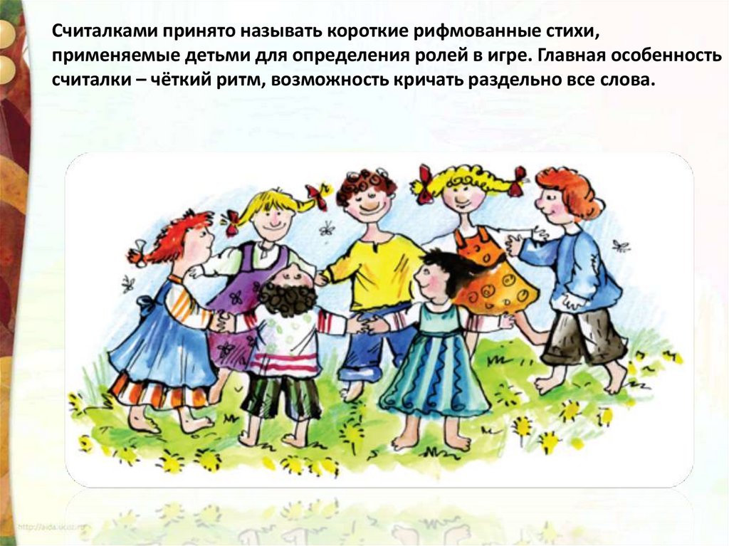 Считалками принято называть короткие рифмованные стихи,применяемые детьми для определения ролей в игре. Главная особенность