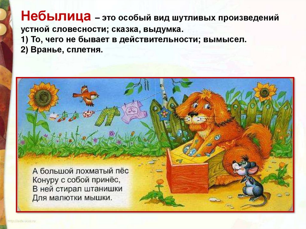 Небылица – это особый вид шутливых произведенийустной словесности; сказка, выдумка.