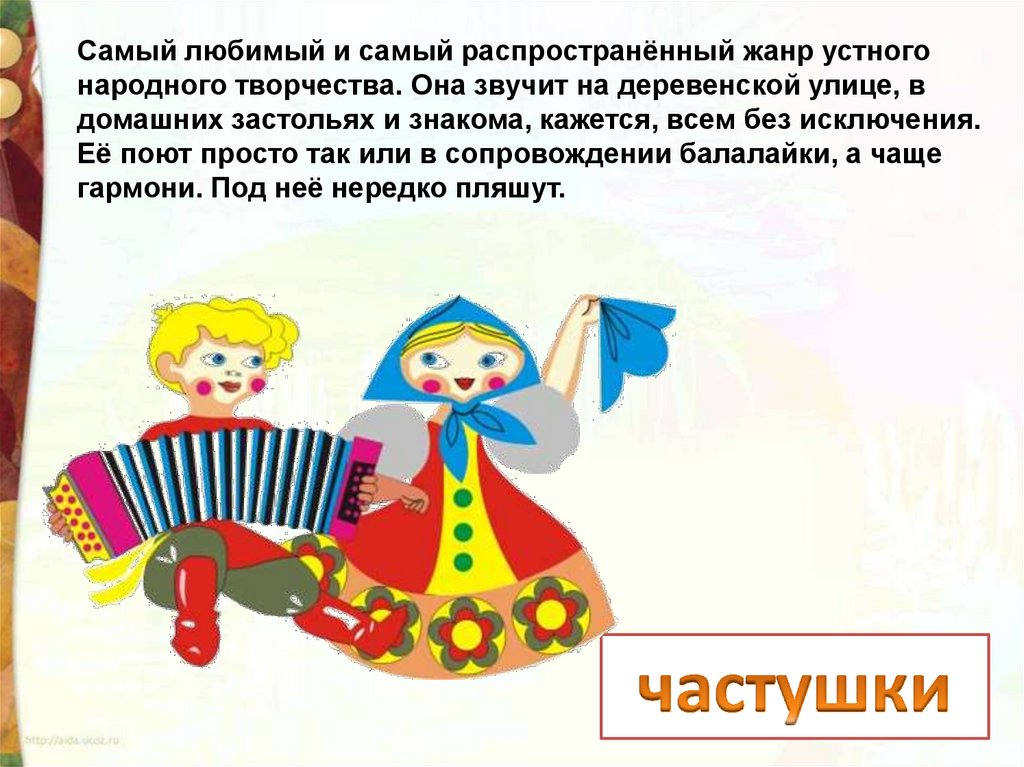 Самый любимый и самый распространённый жанр устногонародного творчества. Она звучит на деревенской улице, в