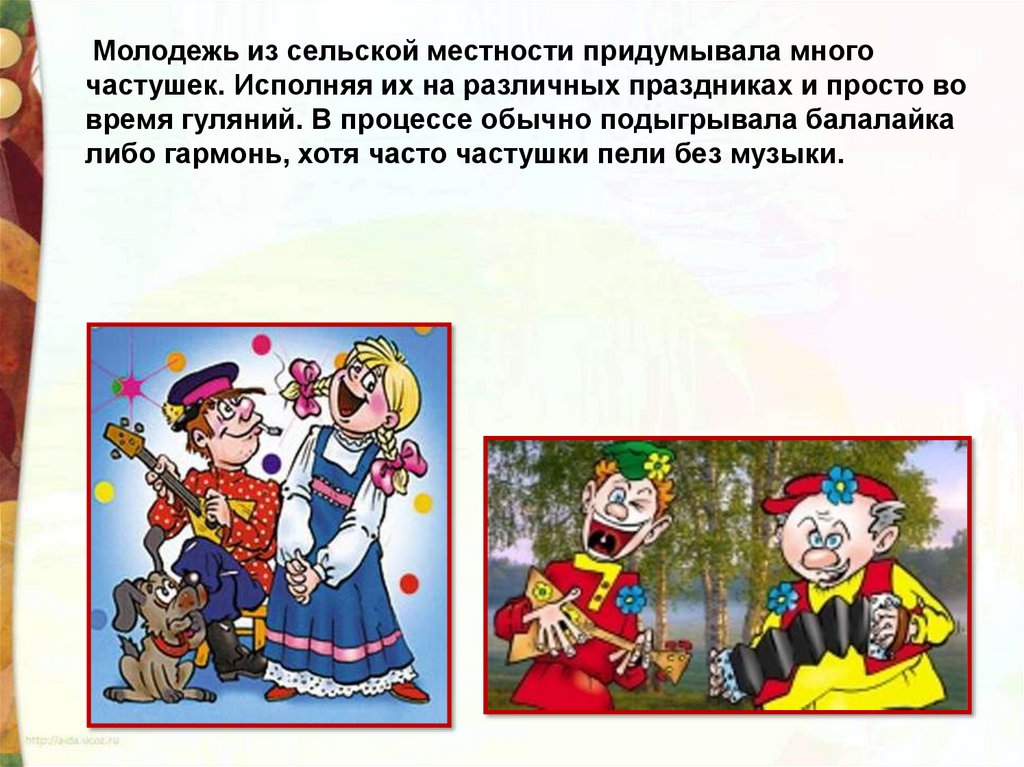 Молодежь из сельской местности придумывала многочастушек. Исполняя их на различных праздниках и просто во