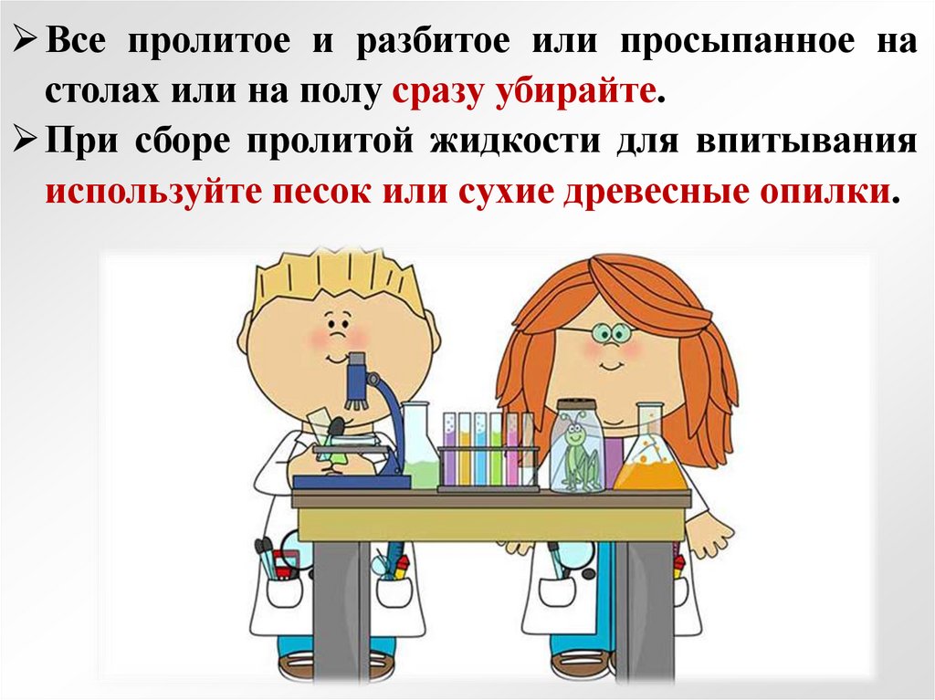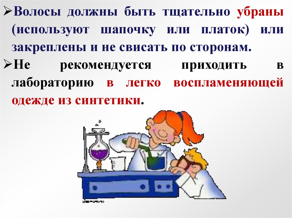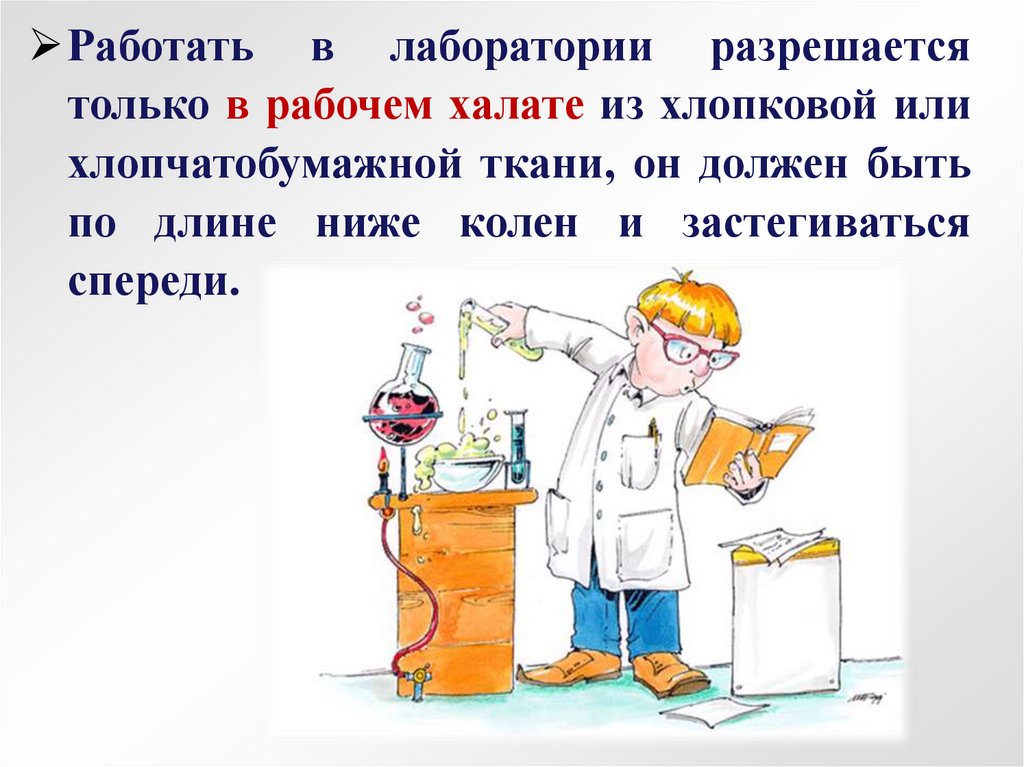 Работать в лаборатории разрешаетсятолько в рабочем халате из хлопковой или