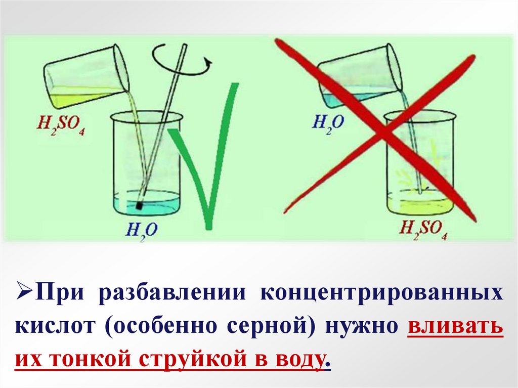 При разбавлении концентрированныхкислот (особенно серной) нужно вливать