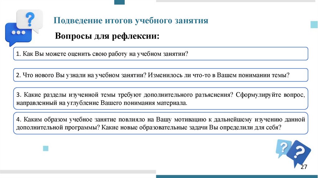 Подведение итогов учебного занятияВопросы для рефлексии: