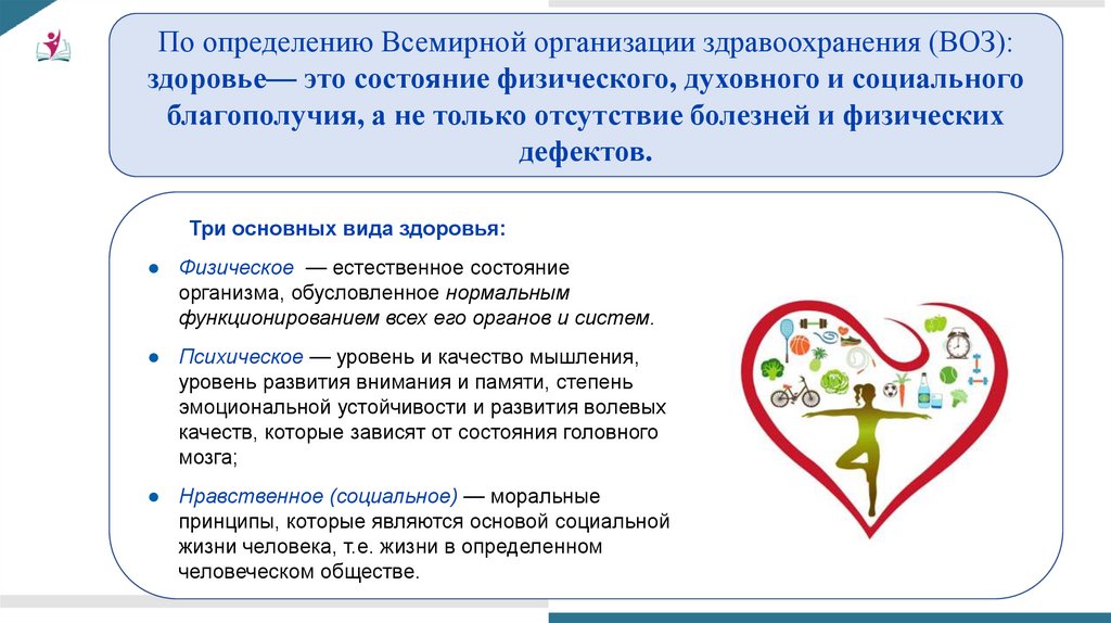 По определению Всемирной организации здравоохранения (ВОЗ):здоровье— это состояние физического, духовного и социального