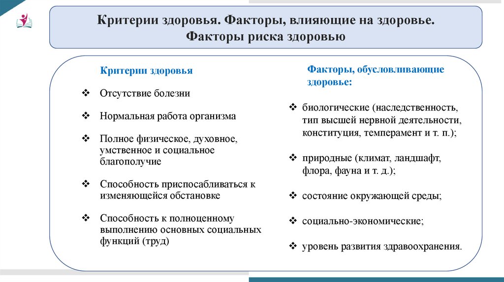 Критерии здоровья. Факторы, влияющие на здоровье.Факторы риска здоровью