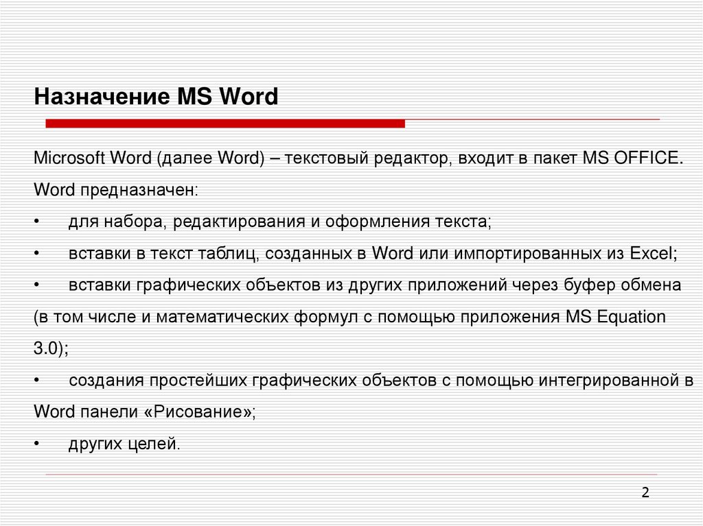 Назначение MS WordMicrosoft Word (далее Word) – текстовый редактор, входит в пакет MS OFFICE.