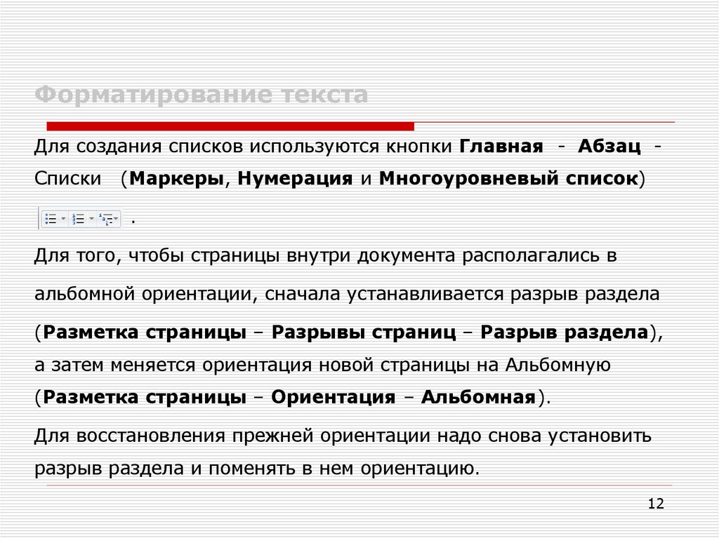 Форматирование текстаДля создания списков используются кнопки Главная - Абзац Списки