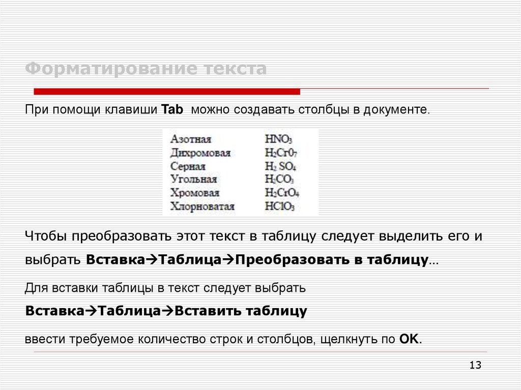Форматирование текстаПри помощи клавиши Tab можно создавать столбцы в документе.