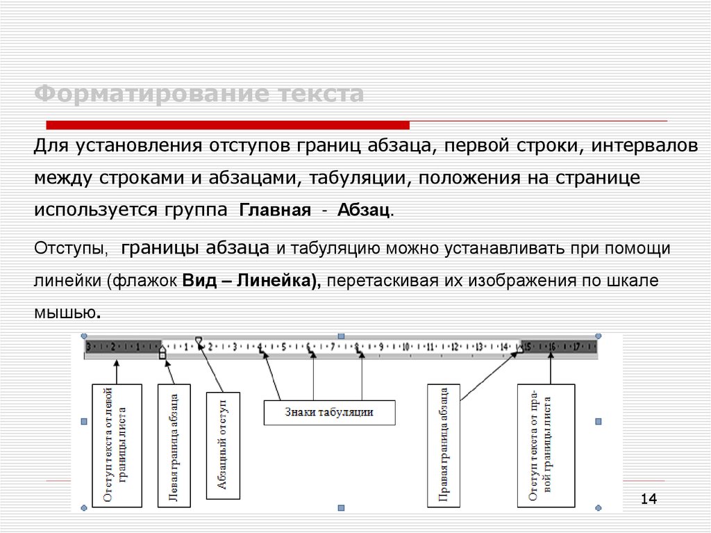 Форматирование текстаДля установления отступов границ абзаца, первой строки, интервалов