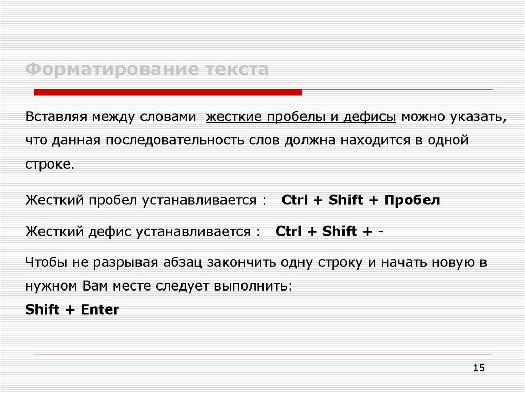 Форматирование текстаВставляя между словами жесткие пробелы и дефисы можно указать,