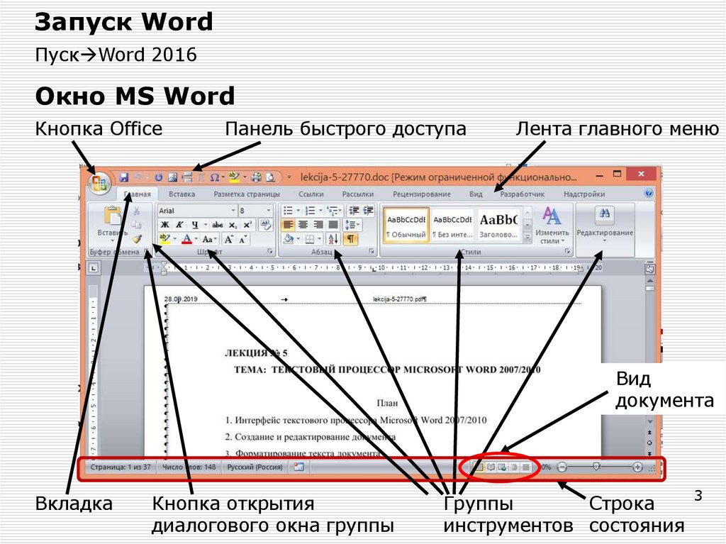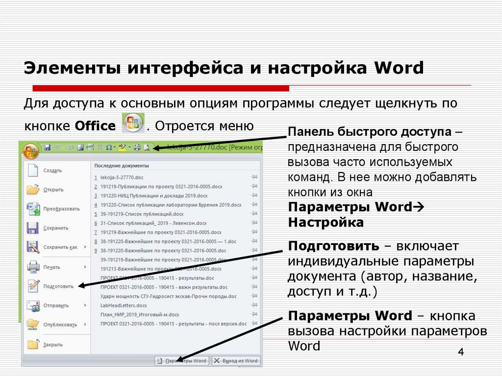 Элементы интерфейса и настройка WordДля доступа к основным опциям программы следует щелкнуть по