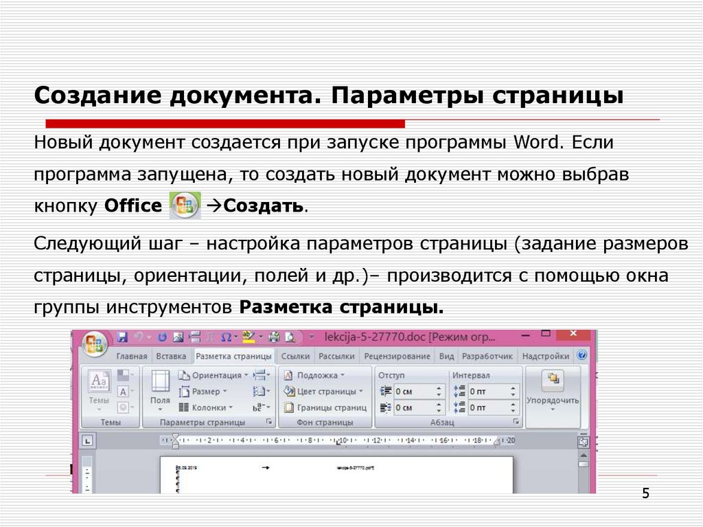 Создание документа. Параметры страницыНовый документ создается при запуске программы Word. Если