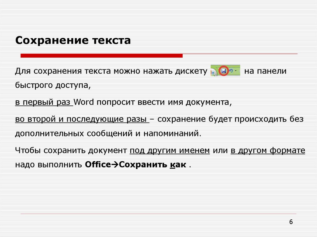 Сохранение текстаДля сохранения текста можно нажать дискету